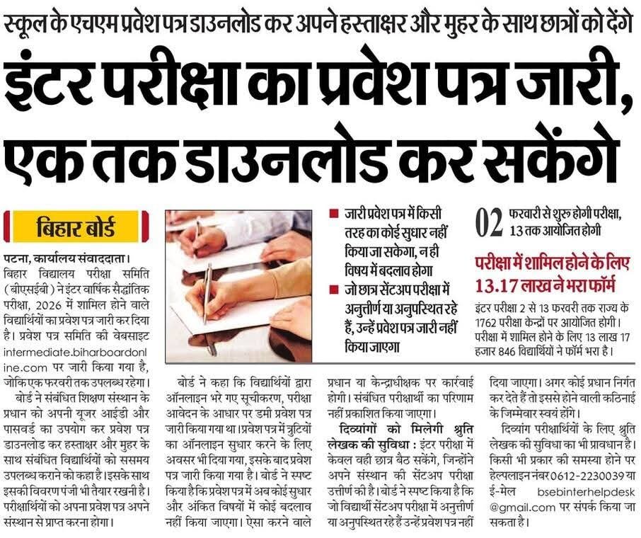 बिहार बोर्ड द्वारा जो इंटर फाइनल परीक्षा का एडमिट कार्ड जारी किया गया है जिसे आप 1 फरवरी 2026 तक प्राप्त कर सकते हैं आप अपने स्कूल कॉलेज में जाकर एडमिट कार्ड प्राप्त कर सकते हैं क्योंकि बहुत ऐसे विद्यार्थी है जो ऑनलाइन के माध्यम से नहीं चेक कर पाते हैं तो आप अपने स्कूल कॉलेज में जाकर प्राप्त कर सकते हैं