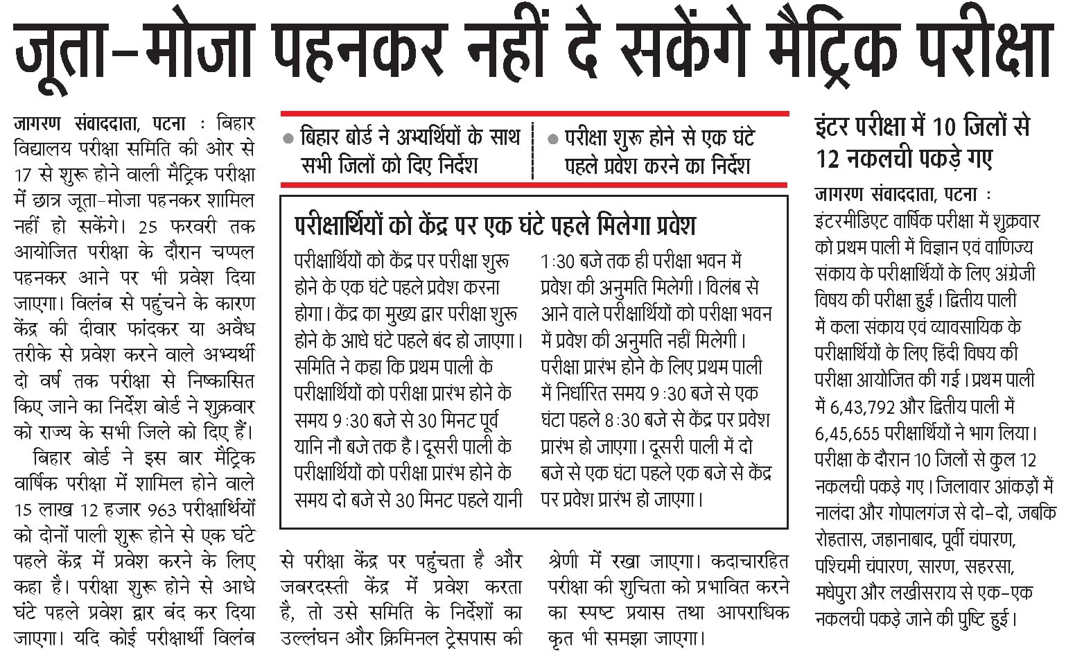 आप मैट्रिक परीक्षा में जूता और मौज पहनकर नहीं जा सकते हैं अगर जूता पहनकर आप मैट्रिक परीक्षा में जाते हैं तो आपको परीक्षा हॉल में बैठने की अनुमति नहीं दी जाएगी इसीलिए आप सभी विद्यार्थी परीक्षा देने चप्पल पर ही जाए