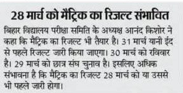 अब आप सभी विद्यार्थियों का केवल एक ही प्रश्न है कि आखिर बिहार बोर्ड द्वारा मैट्रिक परीक्षा का फाइनल रिजल्ट किस तिथि को जारी किया जाएगा तो मैं आपको बतला दूं कि बिहार बोर्ड द्वारा अब तक रिजल्ट जारी को लेकर ऑफिशियल तिथि जारी नहीं किया गया है, लेकिन बिहार बोर्ड वेरीफिकेशन शुरू कर दिया गया है। टॉपर वेरिफिकेशन 27 मार्च तक चलेगा जिससे पता चलता है कि 28 मार्च को आप सभी विद्यार्थियों का रिजल्ट जारी हो सकता है।