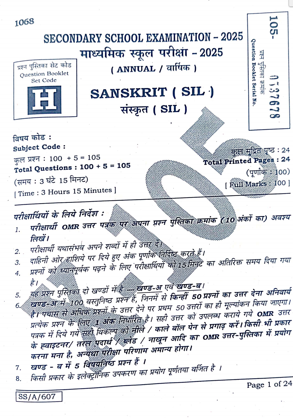 Bihar Board 10th Sanskrit 1st sift Answer Key 2025 All Sets All Sets:-