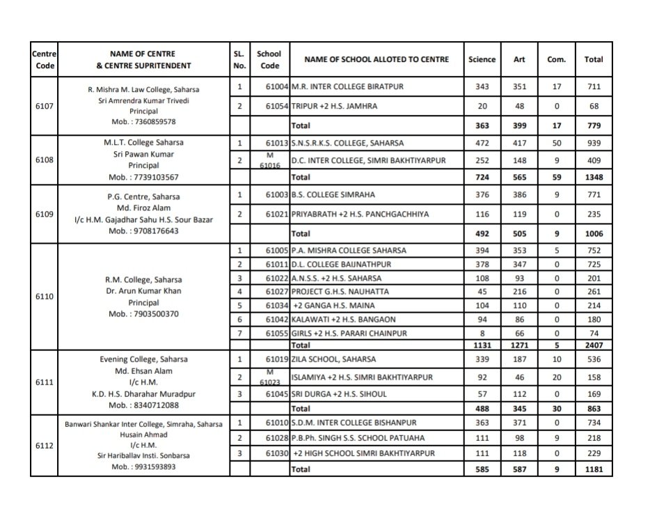 Bihar Board 12th Exam Center List 2025 District Wise:-