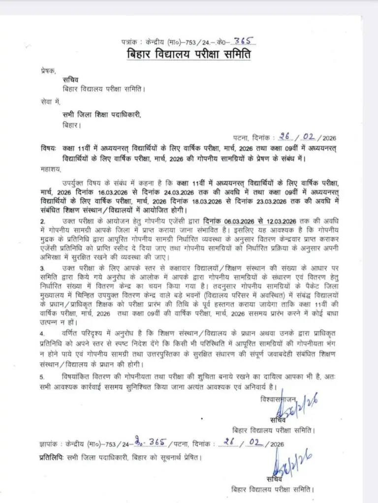दोस्तों आप भी बिहार बोर्ड नौवीं के विद्यार्थी है तो आपको बतला दे कि आपका फाइनल परीक्षा को लेकर बिहार बोर्ड के तरफ से अपडेट जारी कर दिया गया है आपको बतला दे की 26 फरवरी 2026 को बिहार बोर्ड ने ऑफिशल नोटिफिकेशन जारी किया और बतलाया कि कक्षा 9वीं की वार्षिक परीक्षा का शुभारंभ 18 मार्च 2026 से लेकर 23 मार्च 2026 के बीच आयोजित होने वाली है, और कक्षा 9वीं की वार्षिक परीक्षा 2026 को दो पाली में आयोजित की जाएगी प्रथम पाली की परीक्षा, 9:30 AM से 12:45 PM तक प्रथम पाली की परीक्षा चलेगी और द्वितीय पाली की परीक्षा 2:00 PM से 5:15 PM द्वितीय पाली की परीक्षा चलेगी।