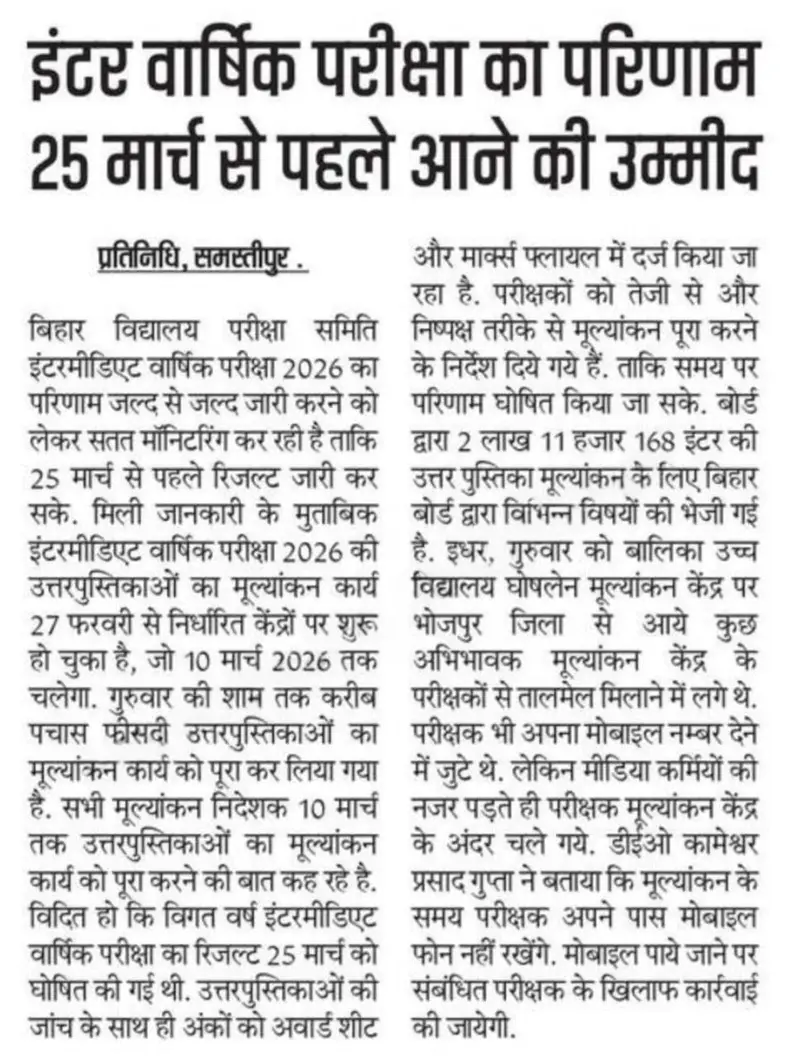 बिहार बोर्ड के द्वारा इंटर की वार्षिक परीक्षा 2026 में 13 लाख से अधिक परीक्षार्थी शामिल हुए हैं और उन सभी परीक्षार्थी का इंतजार है कि इंटर का परीक्षा परिणाम कब जारी किया जाएगा तो सूत्रों से मिली जानकारी के अनुसार इंटर वार्षिक परीक्षा 2026 का परिणाम 20 मार्च 2026 से लेकर 25 मार्च 2026 के बीच जारी होने की संभावना है बिहार बोर्ड के द्वारा इंटर कॉफी मूल्यांकन कार्य 27 फरवरी 2026 को शुरू कर दिया गया है और 10 मार्च 2026 तक इंटर कॉपी मूल्यांकन कार्य चलने वाला है।
