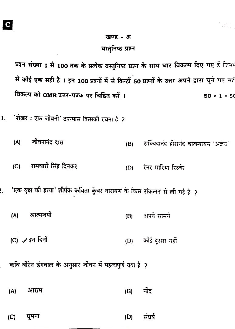 Bihar board Class 10th 17 February Hindi 1st sitting answer key 2026:-