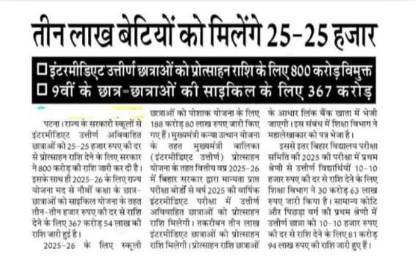 बिहार बोर्ड कक्षा 12वीं 2025 परीक्षा में उत्तीर्ण छात्रों के लिए बड़ी खुशखबरी है। बिहार सरकार की मुख्यमंत्री कन्या उत्थान योजना 2025 के तहत अब इंटर पास छात्राओं को ₹25,000 की स्कॉलरशिप राशि दी जाएगी।