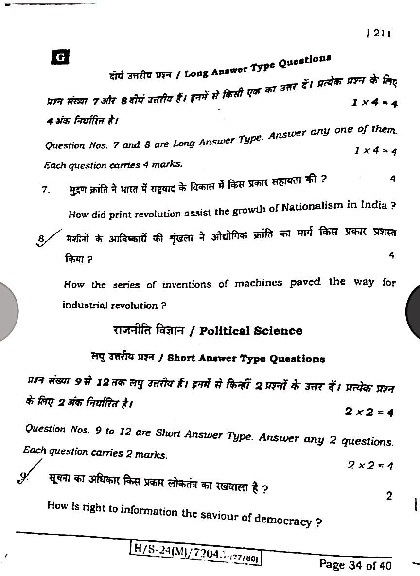 Class 10th 20 February Social Science पेपर:-