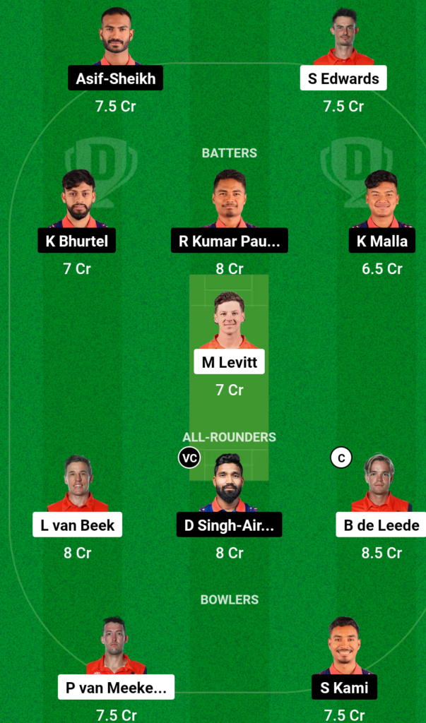 माइकल लेविट, मैक्स ओडॉड, विक्रमजीत सिंह, सिब्रांड एंजेलब्रेक्ट, बास डी लीडे, स्कॉट एडवर्ड्स (कप्तान और विकेटकीपर), वेस्ले बैरेसी, लोगान वैन बीक, टिम प्रिंगल, पॉल वैन मीकेरेन, विवियन किंगमा